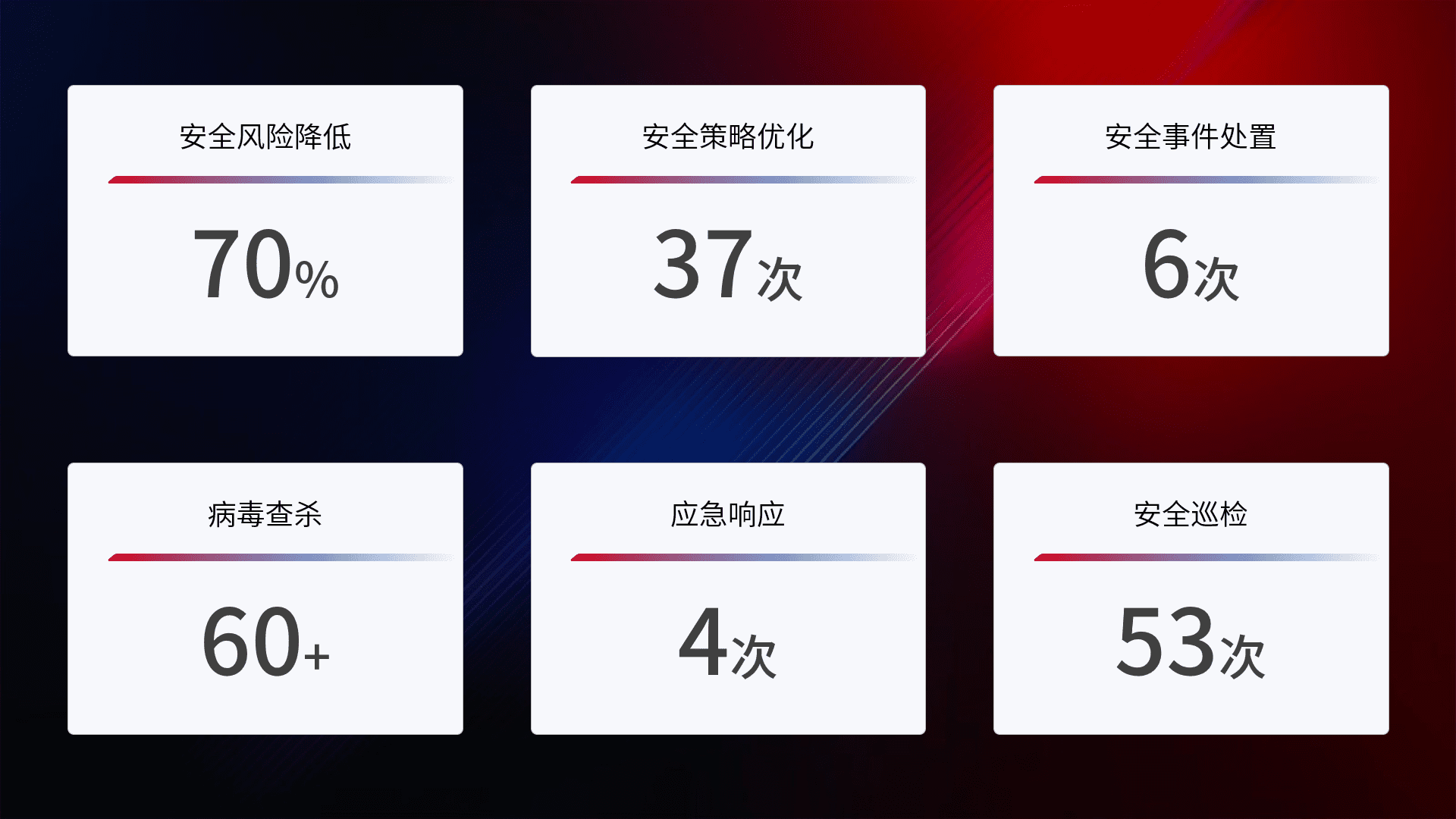 提供全面的安全事件报告体系,,,,包括处置报告、、周报、、、、季度和年度总结,,,,结合持续监控,,,,帮助客户深入了解网络安全状况。。。。